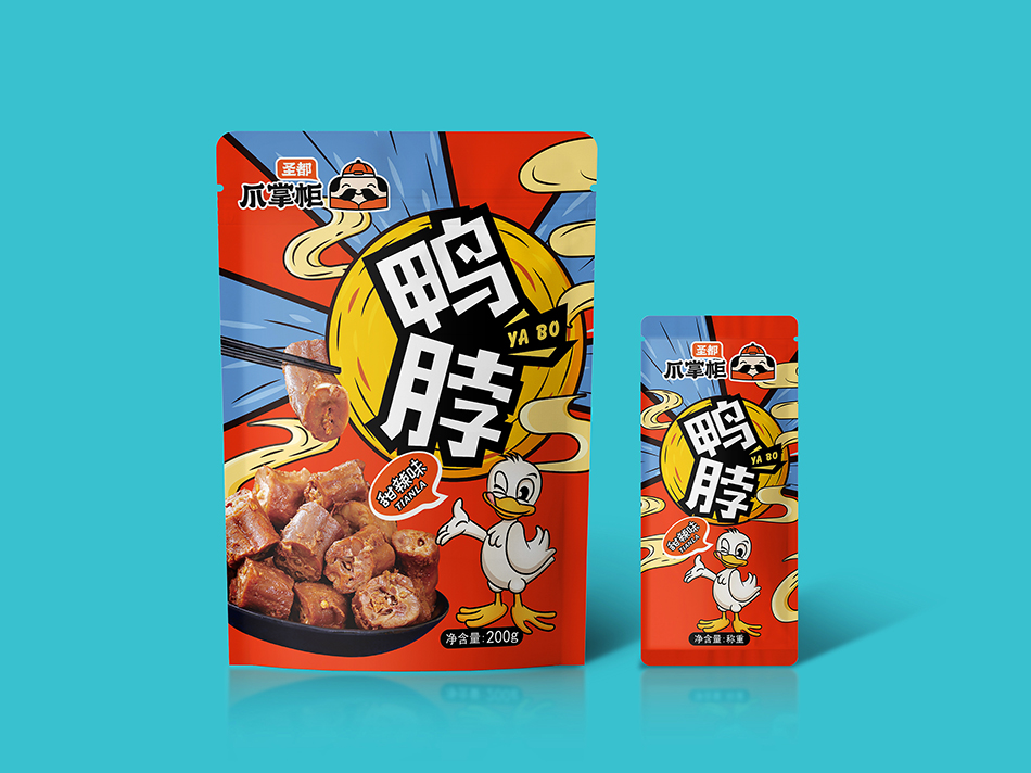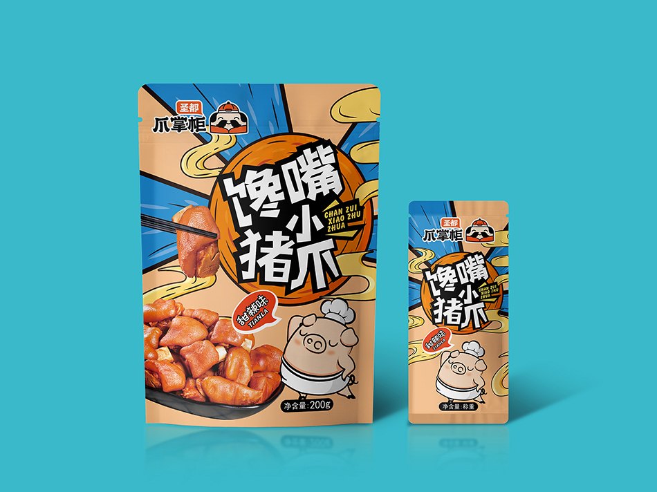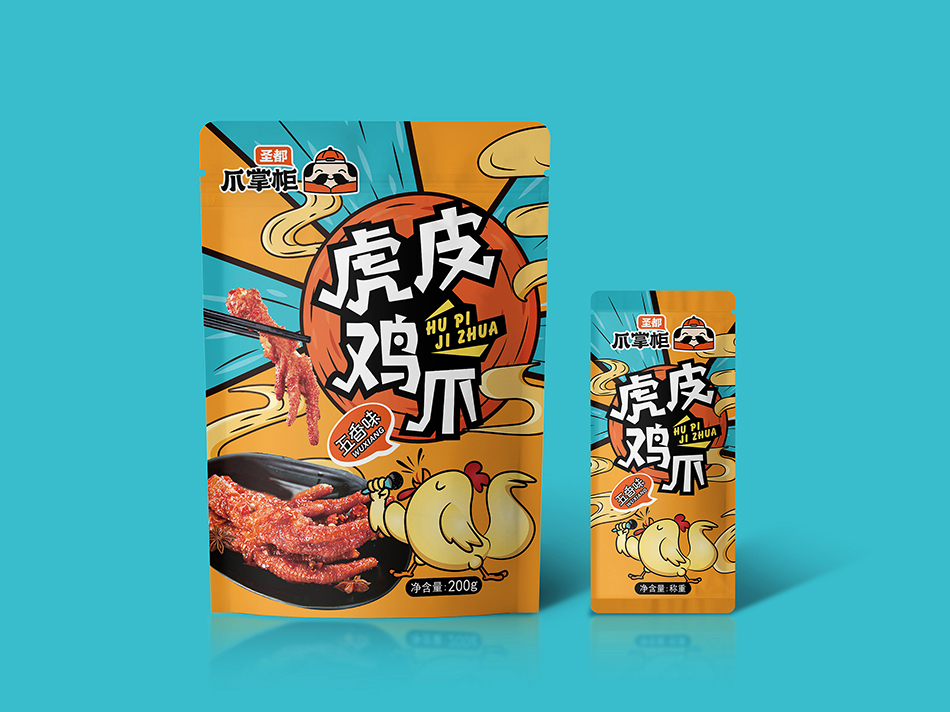 圣都食品是一家專業(yè)生產(chǎn)研發(fā)銷售鹵味熟食的連鎖品牌。近30年的老品牌,6萬多平方米的食品工廠,每日生產(chǎn)近200款熟食產(chǎn)品。全國600+門店和商超,通過強大的冷鏈運輸體系。 2020年圣都熟食升級品牌“圣都爪掌柜”。主打爆品爪系列風靡全城。麻辣無骨爪系列,檸檬無骨爪系列,鳳爪系列,全手工去骨工藝,完整保留筋肉,獨家秘制配方,口感更帶勁。 是也設計有幸受圣都食品負責人委托,為其設計新款產(chǎn)品包裝。